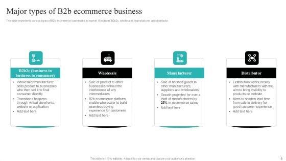 This slide represents various types of B2b ecommerce businesses in market. It includes B2b2c, wholesaler, manufacturer and distributor. Crafting an eye-catching presentation has never been more straightforward. Let your presentation shine with this tasteful yet straightforward Strategic Ecommerce Plan For B2B Enterprises Major Types Of B2b Ecommerce Business Slides PDF template. It offers a minimalistic and classy look that is great for making a statement. The colors have been employed intelligently to add a bit of playfulness while still remaining professional. Construct the ideal Strategic Ecommerce Plan For B2B Enterprises Major Types Of B2b Ecommerce Business Slides PDF that effortlessly grabs the attention of your audience Begin now and be certain to wow your customers