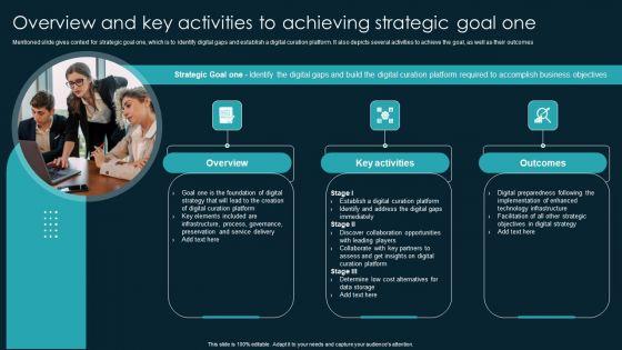 Mentioned slide gives context for strategic goal one, which is to identify digital gaps and establish a digital curation platform. It also depicts several activities to achieve the goal, as well as their outcomes. Formulating a presentation can take up a lot of effort and time, so the content and message should always be the primary focus. The visuals of the PowerPoint can enhance the presenters message, so our Overview And Key Activities To Achieving Strategic Goal One Microsoft PDF was created to help save time. Instead of worrying about the design, the presenter can concentrate on the message while our designers work on creating the ideal templates for whatever situation is needed. Slidegeeks has experts for everything from amazing designs to valuable content, we have put everything into Overview And Key Activities To Achieving Strategic Goal One Microsoft PDF.