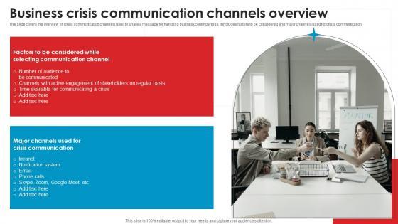 The slide covers the overview of crisis communication channels used to share a message for handling business contingencies. It includes factors to be considered and major channels used for crisis communication Take your projects to the next level with our ultimate collection of Business Crisis Communication Strategic Guide Crisis Communication Planning Topics Pdf. Slidegeeks has designed a range of layouts that are perfect for representing task or activity duration, keeping track of all your deadlines at a glance. Tailor these designs to your exact needs and give them a truly corporate look with your own brand colors they will make your projects stand out from the rest The slide covers the overview of crisis communication channels used to share a message for handling business contingencies. It includes factors to be considered and major channels used for crisis communication