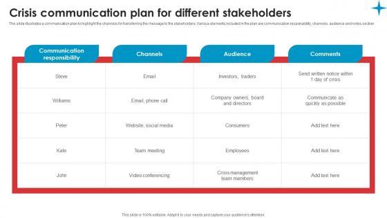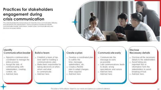 The slide illustrates the best practices to make the crisis communication effective and valuable for the stakeholders. Various practices included are identify communication leader, build a team, create a plan, communicate early and disclose necessary details Make sure to capture your audiences attention in your business displays with our gratis customizable Practices For Stakeholders Strategic Guide Crisis Communication Planning Themes Pdf. These are great for business strategies, office conferences, capital raising or task suggestions. If you desire to acquire more customers for your tech business and ensure they stay satisfied, create your own sales presentation with these plain slides. The slide illustrates the best practices to make the crisis communication effective and valuable for the stakeholders. Various practices included are identify communication leader, build a team, create a plan, communicate early and disclose necessary details