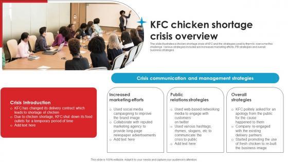 The slide illustrates a chicken shortage crisis of KFC and the strategies used by them to overcome this challenge. Various strategies included are increased marketing efforts, PR strategies and overall business strategies Whether you have daily or monthly meetings, a brilliant presentation is necessary. KFC Chicken Shortage Crisis Strategic Guide Crisis Communication Planning Demonstration Pdf can be your best option for delivering a presentation. Represent everything in detail using KFC Chicken Shortage Crisis Strategic Guide Crisis Communication Planning Demonstration Pdf and make yourself stand out in meetings. The template is versatile and follows a structure that will cater to your requirements. All the templates prepared by Slidegeeks are easy to download and edit. Our research experts have taken care of the corporate themes as well. So, give it a try and see the results. The slide illustrates a chicken shortage crisis of KFC and the strategies used by them to overcome this challenge. Various strategies included are increased marketing efforts, PR strategies and overall business strategies