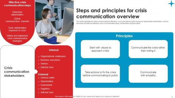 The slide highlights the steps and principles to effectively communicate the right message to appropriate stakeholders. Various elements included are effective crisis communication steps, stakeholders and principles The Steps And Principles For Crisis Strategic Guide Crisis Communication Planning Slides Pdf is a compilation of the most recent design trends as a series of slides. It is suitable for any subject or industry presentation, containing attractive visuals and photo spots for businesses to clearly express their messages. This template contains a variety of slides for the user to input data, such as structures to contrast two elements, bullet points, and slides for written information. Slidegeeks is prepared to create an impression. The slide highlights the steps and principles to effectively communicate the right message to appropriate stakeholders. Various elements included are effective crisis communication steps, stakeholders and principles