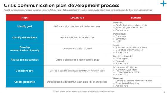 The slide carries a crisis communication development process to effectively manage the business crisis on time. Various steps involved are identify goals, identify stakeholders, develop communication hierarchy, etc. Here you can discover an assortment of the finest PowerPoint and Google Slides templates. With these templates, you can create presentations for a variety of purposes while simultaneously providing your audience with an eye catching visual experience. Download Strategic Guide Crisis Communication Planning Crisis Communication Plan Portrait Pdf to deliver an impeccable presentation. These templates will make your job of preparing presentations much quicker, yet still, maintain a high level of quality. Slidegeeks has experienced researchers who prepare these templates and write high quality content for you. Later on, you can personalize the content by editing the Strategic Guide Crisis Communication Planning Crisis Communication Plan Portrait Pdf. The slide carries a crisis communication development process to effectively manage the business crisis on time. Various steps involved are identify goals, identify stakeholders, develop communication hierarchy, etc.