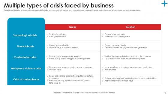 The slide highlights the various crisis and issues that affects the business continuity. Various types included are technological, financial, confrontation, workplace violence and crisis of malevolence If your project calls for a presentation, then Slidegeeks is your go to partner because we have professionally designed, easy to edit templates that are perfect for any presentation. After downloading, you can easily edit Multiple Types Of Crisis Faced Strategic Guide Crisis Communication Planning Summary Pdf and make the changes accordingly. You can rearrange slides or fill them with different images. Check out all the handy templates The slide highlights the various crisis and issues that affects the business continuity. Various types included are technological, financial, confrontation, workplace violence and crisis of malevolence