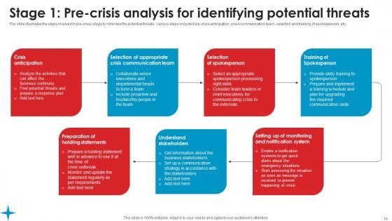 The slide illustrates the steps involved in pre crisis stage to minimize the potential threats. Various steps included are crisis anticipation, crisis communication team, selection and training of spokesperson, etc. This Stage 1 Pre Crisis Analysis Identifying Strategic Guide Crisis Communication Planning Elements Pdf is perfect for any presentation, be it in front of clients or colleagues. It is a versatile and stylish solution for organizing your meetings. The Stage 1 Pre Crisis Analysis Identifying Strategic Guide Crisis Communication Planning Elements Pdf features a modern design for your presentation meetings. The adjustable and customizable slides provide unlimited possibilities for acing up your presentation. Slidegeeks has done all the homework before launching the product for you. So, do not wait, grab the presentation templates today The slide illustrates the steps involved in pre crisis stage to minimize the potential threats. Various steps included are crisis anticipation, crisis communication team, selection and training of spokesperson, etc.