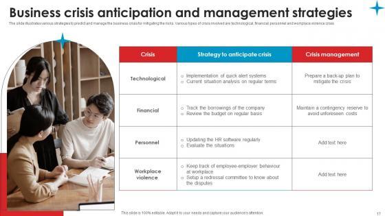 The slide illustrates various strategies to predict and manage the business crisis for mitigating the risks. Various types of crisis involved are technological, financial, personnel and workplace violence crisis This Business Crisis Anticipation And Strategic Guide Crisis Communication Planning Formats Pdf from Slidegeeks makes it easy to present information on your topic with precision. It provides customization options, so you can make changes to the colors, design, graphics, or any other component to create a unique layout. It is also available for immediate download, so you can begin using it right away. Slidegeeks has done good research to ensure that you have everything you need to make your presentation stand out. Make a name out there for a brilliant performance. The slide illustrates various strategies to predict and manage the business crisis for mitigating the risks. Various types of crisis involved are technological, financial, personnel and workplace violence crisis