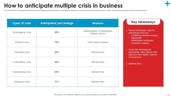 The slide outlines the anticipation techniques for identifying potential threats in organizational department. Various elements included are types of crisis, anticipated percentage, reasons and techniques From laying roadmaps to briefing everything in detail, our templates are perfect for you. You can set the stage with your presentation slides. All you have to do is download these easy to edit and customizable templates. How To Anticipate Multiple Crisis Strategic Guide Crisis Communication Planning Mockup Pdf will help you deliver an outstanding performance that everyone would remember and praise you for. Do download this presentation today. The slide outlines the anticipation techniques for identifying potential threats in organizational department. Various elements included are types of crisis, anticipated percentage, reasons and techniques