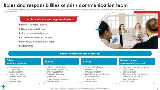 The slide outlines the functions of crisis communication team to effectively share information with the parties involved. It include functions of crisis management team, PR manager, HR head, IT head, marketing and communication head Coming up with a presentation necessitates that the majority of the effort goes into the content and the message you intend to convey. The visuals of a PowerPoint presentation can only be effective if it supplements and supports the story that is being told. Keeping this in mind our experts created Roles And Responsibilities Crisis Strategic Guide Crisis Communication Planning Elements Pdf to reduce the time that goes into designing the presentation. This way, you can concentrate on the message while our designers take care of providing you with the right template for the situation. The slide outlines the functions of crisis communication team to effectively share information with the parties involved. It include functions of crisis management team, PR manager, HR head, IT head, marketing and communication head