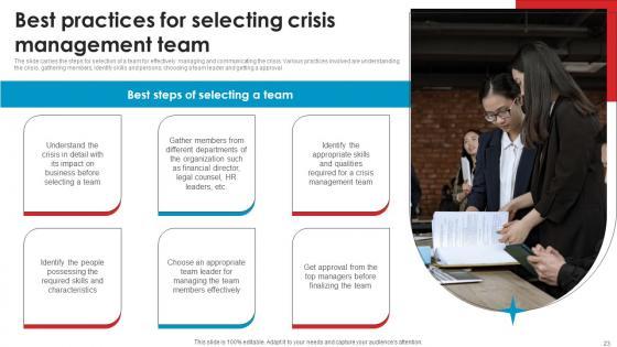 The slide carries the steps for selection of a team for effectively managing and communicating the crisis. Various practices involved are understanding the crisis, gathering members, identify skills and persons, choosing a team leader and getting a approval Here you can discover an assortment of the finest PowerPoint and Google Slides templates. With these templates, you can create presentations for a variety of purposes while simultaneously providing your audience with an eye catching visual experience. Download Best Practices For Selecting Crisis Strategic Guide Crisis Communication Planning Pictures Pdf to deliver an impeccable presentation. These templates will make your job of preparing presentations much quicker, yet still, maintain a high level of quality. Slidegeeks has experienced researchers who prepare these templates and write high quality content for you. Later on, you can personalize the content by editing the Best Practices For Selecting Crisis Strategic Guide Crisis Communication Planning Pictures Pdf. The slide carries the steps for selection of a team for effectively managing and communicating the crisis. Various practices involved are understanding the crisis, gathering members, identify skills and persons, choosing a team leader and getting a approval