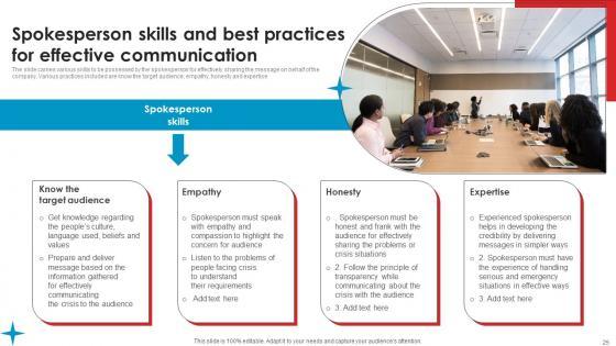 The slide carries various skills to be possessed by the spokesperson for effectively sharing the message on behalf of the company. Various practices included are know the target audience, empathy, honesty and expertise This modern and well arranged Spokesperson Skills Best Strategic Guide Crisis Communication Planning Microsoft Pdf provides lots of creative possibilities. It is very simple to customize and edit with the Powerpoint Software. Just drag and drop your pictures into the shapes. All facets of this template can be edited with Powerpoint, no extra software is necessary. Add your own material, put your images in the places assigned for them, adjust the colors, and then you can show your slides to the world, with an animated slide included. The slide carries various skills to be possessed by the spokesperson for effectively sharing the message on behalf of the company. Various practices included are know the target audience, empathy, honesty and expertise