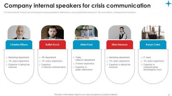 The slide exhibits the companys top ranked speakers having specialization in different areas. Various departments included are IT, HR, public relations, marketing and communications Find a pre designed and impeccable Company Internal Speakers Strategic Guide Crisis Communication Planning Microsoft Pdf. The templates can ace your presentation without additional effort. You can download these easy to edit presentation templates to make your presentation stand out from others. So, what are you waiting for Download the template from Slidegeeks today and give a unique touch to your presentation. The slide exhibits the companys top ranked speakers having specialization in different areas. Various departments included are IT, HR, public relations, marketing and communications