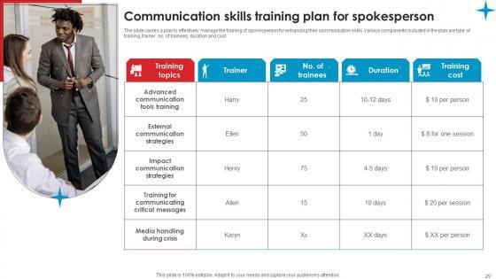 The slide carries a plan to effectively manage the training of spokesperson for enhancing their communication skills. Various components included in the plan are type of training, trainer, no. of trainees, duration and cost Do you know about Slidesgeeks Communication Skills Training Strategic Guide Crisis Communication Planning Diagrams Pdf These are perfect for delivering any kind od presentation. Using it, create PowerPoint presentations that communicate your ideas and engage audiences. Save time and effort by using our pre designed presentation templates that are perfect for a wide range of topic. Our vast selection of designs covers a range of styles, from creative to business, and are all highly customizable and easy to edit. Download as a PowerPoint template or use them as Google Slides themes. The slide carries a plan to effectively manage the training of spokesperson for enhancing their communication skills. Various components included in the plan are type of training, trainer, no. of trainees, duration and cost