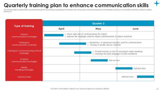 The slide illustrates a quarterly plan for providing training to the spokesperson regarding communication skills. Various types of training included are email etiquettes, training on communication channels, confidence building training, etc. Formulating a presentation can take up a lot of effort and time, so the content and message should always be the primary focus. The visuals of the PowerPoint can enhance the presenters message, so our Quarterly Training Plan Enhance Strategic Guide Crisis Communication Planning Portrait Pdf was created to help save time. Instead of worrying about the design, the presenter can concentrate on the message while our designers work on creating the ideal templates for whatever situation is needed. Slidegeeks has experts for everything from amazing designs to valuable content, we have put everything into Quarterly Training Plan Enhance Strategic Guide Crisis Communication Planning Portrait Pdf The slide illustrates a quarterly plan for providing training to the spokesperson regarding communication skills. Various types of training included are email etiquettes, training on communication channels, confidence building training, etc.