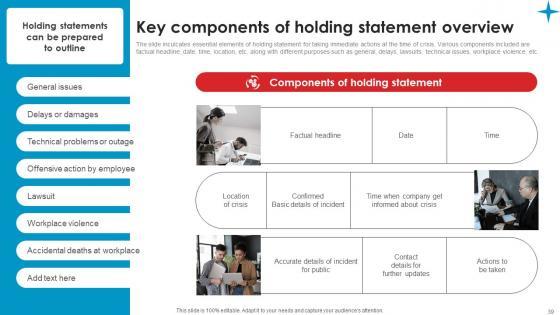 The slide inculcates essential elements of holding statement for taking immediate actions at the time of crisis. Various components included are factual headline, date, time, location, etc. along with different purposes such as general, delays, lawsuits, technical issues, workplace violence, etc. Do you have an important presentation coming up Are you looking for something that will make your presentation stand out from the rest Look no further than Key Components Holding Strategic Guide Crisis Communication Planning Introduction Pdf. With our professional designs, you can trust that your presentation will pop and make delivering it a smooth process. And with Slidegeeks, you can trust that your presentation will be unique and memorable. So why wait Grab Key Components Holding Strategic Guide Crisis Communication Planning Introduction Pdf today and make your presentation stand out from the rest The slide inculcates essential elements of holding statement for taking immediate actions at the time of crisis. Various components included are factual headline, date, time, location, etc. along with different purposes such as general, delays, lawsuits, technical issues, workplace violence, etc.