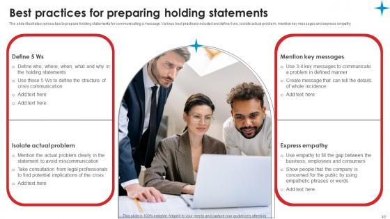 The slide illustrates various tips to prepare holding statements for communicating a message. Various best practices included are define 5 ws, isolate actual problem, mention key messages and express empathy Presenting this PowerPoint presentation, titled Best Practices For Preparing Strategic Guide Crisis Communication Planning Clipart Pdf, with topics curated by our researchers after extensive research. This editable presentation is available for immediate download and provides attractive features when used. Download now and captivate your audience. Presenting this Best Practices For Preparing Strategic Guide Crisis Communication Planning Clipart Pdf. Our researchers have carefully researched and created these slides with all aspects taken into consideration. This is a completely customizable Best Practices For Preparing Strategic Guide Crisis Communication Planning Clipart Pdf that is available for immediate downloading. Download now and make an impact on your audience. Highlight the attractive features available with our PPTs. The slide illustrates various tips to prepare holding statements for communicating a message. Various best practices included are define 5 ws, isolate actual problem, mention key messages and express empathy