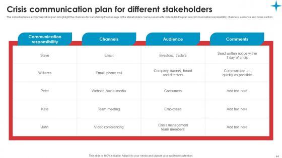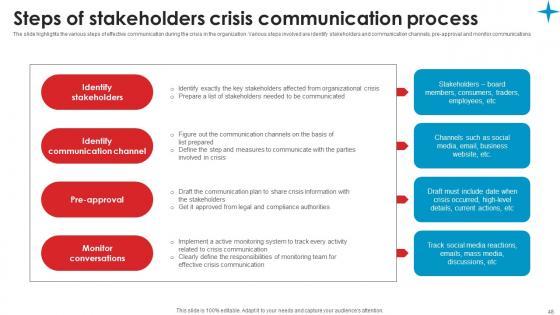 This is a professional and ready to use PowerPoint deck for entrepreneurs,who want to showcase their business in the best light possible. Use this Strategic Guide For Crisis Communication Planning Management Ppt Powerpoint Presentation Complete Deck and prepare an engaging pitch to showcase potential in the industry of your choice. Whether you are just starting out or business or planning to scale,deploy this sixty nine slide complete deck to demonstrate your ideas for bringing innovation and creativity in the business. The presentation template is also equipped to do this with its 100 percent editable and customizable capability. Download now. Our Strategic Guide For Crisis Communication Planning Management Ppt Powerpoint Presentation Complete Deck are topically designed to provide an attractive backdrop to any subject. Use them to look like a presentation pro.