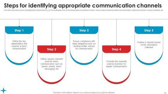 The slide covers the process of identifying the right channel for communicating the crisis to the stakeholders in an efficient manner. Various steps included are define key stakeholders, outline the channels, ensure compliance, etc. Retrieve professionally designed Steps Identifying Appropriate Strategic Guide Crisis Communication Planning Summary Pdf to effectively convey your message and captivate your listeners. Save time by selecting pre made slideshows that are appropriate for various topics, from business to educational purposes. These themes come in many different styles, from creative to corporate, and all of them are easily adjustable and can be edited quickly. Access them as PowerPoint templates or as Google Slides themes. You do not have to go on a hunt for the perfect presentation because Slidegeeks got you covered from everywhere. The slide covers the process of identifying the right channel for communicating the crisis to the stakeholders in an efficient manner. Various steps included are define key stakeholders, outline the channels, ensure compliance, etc.