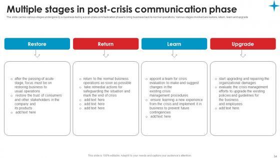 The slide carries various stages undergone by a business during a post crisis communication phase to bring business back to normal operations. Various stages involved are restore, return, learn and upgrade Find highly impressive Multiple Stages In Post Crisis Strategic Guide Crisis Communication Planning Sample Pdf on Slidegeeks to deliver a meaningful presentation. You can save an ample amount of time using these presentation templates. No need to worry to prepare everything from scratch because Slidegeeks experts have already done a huge research and work for you. You need to download Multiple Stages In Post Crisis Strategic Guide Crisis Communication Planning Sample Pdf for your upcoming presentation. All the presentation templates are 100 percent editable and you can change the color and personalize the content accordingly. Download now The slide carries various stages undergone by a business during a post crisis communication phase to bring business back to normal operations. Various stages involved are restore, return, learn and upgrade