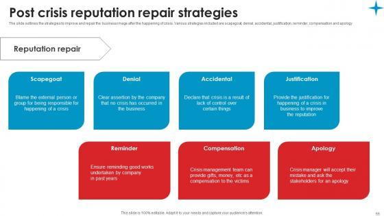 The slide outlines the strategies to improve and repair the business image after the happening of crisis. Various strategies included are scapegoat, denial, accidental, justification, reminder, compensation and apology Crafting an eye catching presentation has never been more straightforward. Let your presentation shine with this tasteful yet straightforward Post Crisis Reputation Repair Strategic Guide Crisis Communication Planning Introduction Pdf template. It offers a minimalistic and classy look that is great for making a statement. The colors have been employed intelligently to add a bit of playfulness while still remaining professional. Construct the ideal Post Crisis Reputation Repair Strategic Guide Crisis Communication Planning Introduction Pdf that effortlessly grabs the attention of your audience Begin now and be certain to wow your customers The slide outlines the strategies to improve and repair the business image after the happening of crisis. Various strategies included are scapegoat, denial, accidental, justification, reminder, compensation and apology