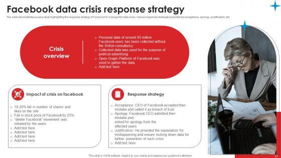The slide demonstrates a case study highlighting the response strategy of Facebook to manage the data crisis. Various response strategies included are acceptance, apology. Justification, etc Get a simple yet stunning designed Facebook Data Crisis Response Strategic Guide Crisis Communication Planning Formats Pdf. It is the best one to establish the tone in your meetings. It is an excellent way to make your presentations highly effective. So, download this PPT today from Slidegeeks and see the positive impacts. Our easy to edit Facebook Data Crisis Response Strategic Guide Crisis Communication Planning Formats Pdf can be your go to option for all upcoming conferences and meetings. So, what are you waiting for Grab this template today. The slide demonstrates a case study highlighting the response strategy of Facebook to manage the data crisis. Various response strategies included are acceptance, apology. Justification, etc