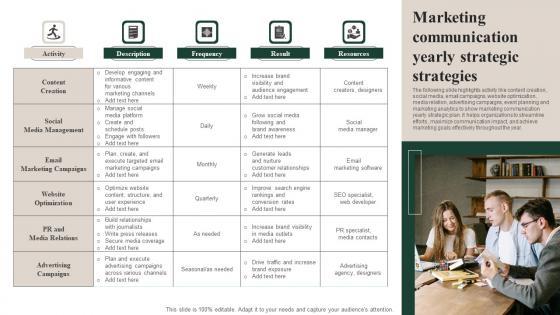 The following slide highlights activity like content creation, social media, email campaigns, website optimization, media relation, advertising campaigns, event planning and marketing analytics to show marketing communication yearly strategic plan. it helps organizations to streamline efforts, maximize communication impact, and achieve marketing goals effectively throughout the year. Showcasing this set of slides titled Marketing Communication Yearly Strategic Strategies Portrait Pdf The topics addressed in these templates are Content Creation, Social Media Management All the content presented in this PPT design is completely editable. Download it and make adjustments in color, background, font etc. as per your unique business setting. The following slide highlights activity like content creation, social media, email campaigns, website optimization, media relation, advertising campaigns, event planning and marketing analytics to show marketing communication yearly strategic plan. it helps organizations to streamline efforts, maximize communication impact, and achieve marketing goals effectively throughout the year.