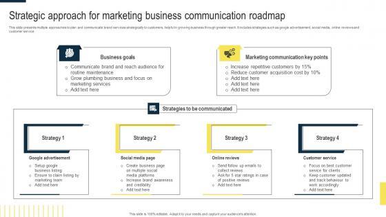 This slide presents multiple approaches to plan and communicate brand services strategically to customers, helpful in growing business through greater reach. It includes strategies such as google advertisement, social media, online reviews and customer service. Showcasing this set of slides titled Strategic Approach For Marketing Business Communication Roadmap Graphics Pdf. The topics addressed in these templates are Google Advertisement, Social Media Page, Online Reviews. All the content presented in this PPT design is completely editable. Download it and make adjustments in color, background, font etc. as per your unique business setting. This slide presents multiple approaches to plan and communicate brand services strategically to customers, helpful in growing business through greater reach. It includes strategies such as google advertisement, social media, online reviews and customer service.
