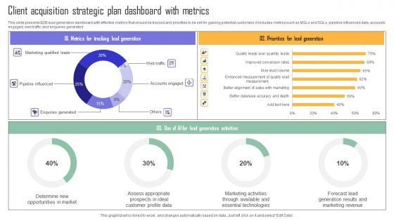 This slide presents B2B lead generation dashboard with effective metrics that should be tracked and priorities to be set for gaining potential customers. It includes metrics such as MQLs and SQLs, pipeline influenced data, accounts engaged, web traffic and enquiries generated. Pitch your topic with ease and precision using this Client Acquisition Strategic Plan Dashboard With Metrics Clipart Pdf. This layout presents information on Priorities For Lead Generation, Tracking Lead Generation. It is also available for immediate download and adjustment. So, changes can be made in the color, design, graphics or any other component to create a unique layout. This slide presents B2B lead generation dashboard with effective metrics that should be tracked and priorities to be set for gaining potential customers. It includes metrics such as MQLs and SQLs, pipeline influenced data, accounts engaged, web traffic and enquiries generated.