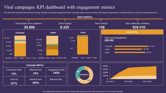 This slide showcases KPI dashboard which can help marketers in assessing engagement metrics. It provides details about user metrics, direct signups, seed contacts, community members, social KPIs, engagement rate, etc. Do you know about Slidesgeeks Strategic Guide To Attract Viral Campaigns KPI Dashboard With Engagement Metrics Summary Pdf These are perfect for delivering any kind od presentation. Using it, create PowerPoint presentations that communicate your ideas and engage audiences. Save time and effort by using our pre-designed presentation templates that are perfect for a wide range of topic. Our vast selection of designs covers a range of styles, from creative to business, and are all highly customizable and easy to edit. Download as a PowerPoint template or use them as Google Slides themes. This slide showcases KPI dashboard which can help marketers in assessing engagement metrics. It provides details about user metrics, direct signups, seed contacts, community members, social KPIs, engagement rate, etc.