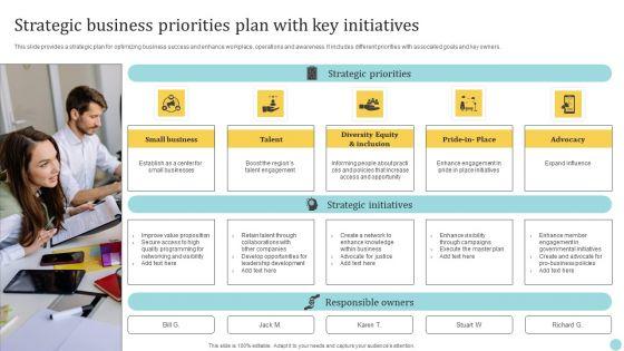 This slide provides a strategic plan for optimizing business success and enhance workplace, operations and awareness. It includes different priorities with associated goals and key owners. Presenting Strategic Business Priorities Plan With Key Initiatives Template PDF to dispense important information. This template comprises five stages. It also presents valuable insights into the topics including Small Business, Talent, Diversity Equity Inclusion. This is a completely customizable PowerPoint theme that can be put to use immediately. So, download it and address the topic impactfully.