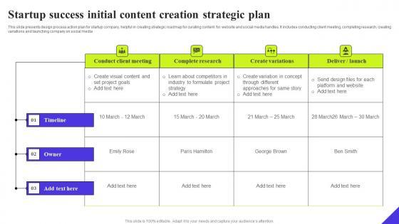 This slide presents design process action plan for startup company, helpful in creating strategic roadmap for curating content for website and social media handles. It includes conducting client meeting, completing research, creating variations and launching company on social media. Pitch your topic with ease and precision using this Startup Success Initial Content Creation Strategic Plan Ppt Ideas Graphics Tutorials Pdf. This layout presents information on Conducting Client Meeting, Completing Research, Creating Variations. It is also available for immediate download and adjustment. So, changes can be made in the color, design, graphics or any other component to create a unique layout. This slide presents design process action plan for startup company, helpful in creating strategic roadmap for curating content for website and social media handles. It includes conducting client meeting, completing research, creating variations and launching company on social media.