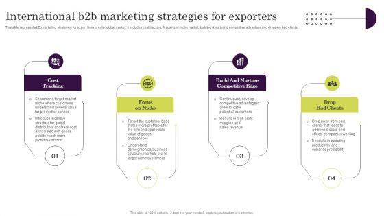 This slide represents b2b marketing strategies for export firms to enter global market. It includes cost tracking, focusing on niche market, building and nurturing competitive advantage and dropping bad clients. Slidegeeks has constructed Guide For Global Marketing International B2B Marketing Strategies For Exporters Formats PDF after conducting extensive research and examination. These presentation templates are constantly being generated and modified based on user preferences and critiques from editors. Here, you will find the most attractive templates for a range of purposes while taking into account ratings and remarks from users regarding the content. This is an excellent jumping-off point to explore our content and will give new users an insight into our top-notch PowerPoint Templates.
