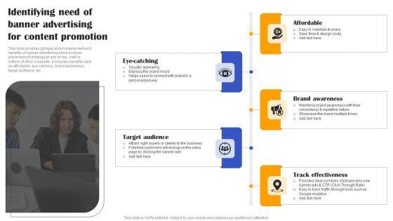 This slide provides glimpse about requirement and benefits of banner advertising which involves placement of rectangular ads on top, side or bottom of others website. It includes benefits such as affordable, eye-catching, brand awareness, target audience, etc. There are so many reasons you need a Execution Of Effective Paid Media Advertising Strategies Identifying Need Of Banner Advertising For Content Icons PDF. The first reason is you cannot spend time making everything from scratch, Thus, Slidegeeks has made presentation templates for you too. You can easily download these templates from our website easily.