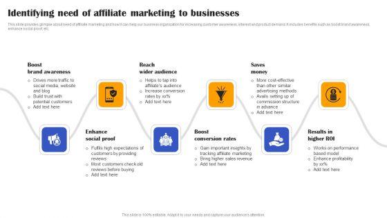This slide provides glimpse about need of affiliate marketing and how it can help our business organization for increasing customer awareness, interest and product demand. It includes benefits such as boost brand awareness, enhance social proof, etc. Make sure to capture your audiences attention in your business displays with our gratis customizable Execution Of Effective Paid Media Advertising Strategies Identifying Need Of Affiliate Marketing To Businesses Elements PDF. These are great for business strategies, office conferences, capital raising or task suggestions. If you desire to acquire more customers for your tech business and ensure they stay satisfied, create your own sales presentation with these plain slides.