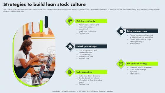 This slide illustrate five wat s to promote a culture of lean stock management in an organization that leads to higher efficiency. It includes elements such as distribute authority, rethink partnership, embrace metrics, bring customer voice and put vision in writing. Pitch your topic with ease and precision using this Strategies To Build Lean Stock Culture Sample Pdf. This layout presents information on Distribute Authority, Rethink Partnerships, Strategies To Build Lean, Stock Culture. It is also available for immediate download and adjustment. So, changes can be made in the color, design, graphics or any other component to create a unique layout. This slide illustrate five wat s to promote a culture of lean stock management in an organization that leads to higher efficiency. It includes elements such as distribute authority, rethink partnership, embrace metrics, bring customer voice and put vision in writing.