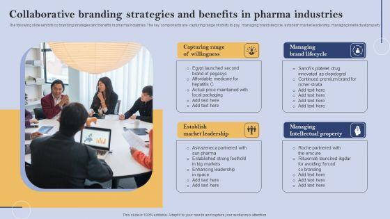 The following slide exhibits co branding strategies and benefits in pharma industries. The key components are- capturing range of ability to pay, managing brand lifecycle, establish market leadership, managing intellectual property Persuade your audience using this Collaborative Branding Strategies And Benefits In Pharma Industries Designs PDF. This PPT design covers four stages, thus making it a great tool to use. It also caters to a variety of topics including Brand Lifecycle, Intellectual Property, Market Leadership. Download this PPT design now to present a convincing pitch that not only emphasizes the topic but also showcases your presentation skills.