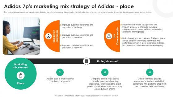 This slide provides an overview of place element of adidas marketing mix strategy. It incorporates the strategy involved, channel used, impact on customers and real life use cases scenario of place strategy. Boost your pitch with our creative A120 Adidas 7ps Marketing Mix Strategy Of Adidas Place Strategy SS V. Deliver an awe-inspiring pitch that will mesmerize everyone. Using these presentation templates you will surely catch everyones attention. You can browse the ppts collection on our website. We have researchers who are experts at creating the right content for the templates. So you do not have to invest time in any additional work. Just grab the template now and use them. This slide provides an overview of place element of adidas marketing mix strategy. It incorporates the strategy involved, channel used, impact on customers and real life use cases scenario of place strategy.