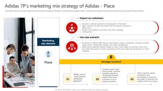 This slide provides an overview of place element of adidas marketing mix strategy. It incorporates the strategy involved, channel used, impact on customers and real life use cases scenario of place strategy. Boost your pitch with our creative Adidas 7ps Marketing Mix Strategy Of Adidas Place Strategy SS V. Deliver an awe-inspiring pitch that will mesmerize everyone. Using these presentation templates you will surely catch everyones attention. You can browse the ppts collection on our website. We have researchers who are experts at creating the right content for the templates. So you do not have to invest time in any additional work. Just grab the template now and use them. This slide provides an overview of place element of adidas marketing mix strategy. It incorporates the strategy involved, channel used, impact on customers and real life use cases scenario of place strategy.