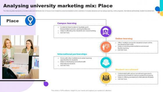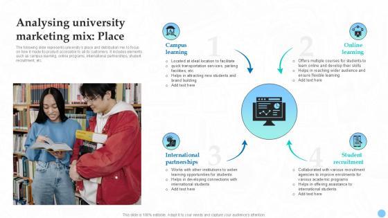 The following slide represents universitys place and distribution mix to focus on how it made its product accessible to all its customers. It includes elements such as campus learning, online programs, international partnerships, student recruitment etc. Slidegeeks is here to make your presentations a breeze with University Marketing Guide Analysing University Marketing Mix Place Strategy SS V With our easy-to-use and customizable templates, you can focus on delivering your ideas rather than worrying about formatting. With a variety of designs to choose from, you are sure to find one that suits your needs. And with animations and unique photos, illustrations, and fonts, you can make your presentation pop. So whether you are giving a sales pitch or presenting to the board, make sure to check out Slidegeeks first The following slide represents universitys place and distribution mix to focus on how it made its product accessible to all its customers. It includes elements such as campus learning, online programs, international partnerships, student recruitment etc.