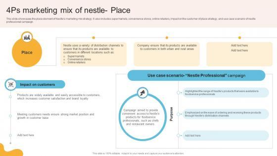 This slide showcases the place element of Nestles marketing mix strategy. It also includes supermarkets, convenience stores, online retailers, impact on the customer of place strategy, and use case scenario of nestle professional campaign. Slidegeeks is one of the best resources for PowerPoint templates. You can download easily and regulate Comprehensive Review Of Nestles 4ps Marketing Mix Of Nestle Place Strategy SS V for your personal presentations from our wonderful collection. A few clicks is all it takes to discover and get the most relevant and appropriate templates. Use our Templates to add a unique zing and appeal to your presentation and meetings. All the slides are easy to edit and you can use them even for advertisement purposes. This slide showcases the place element of Nestles marketing mix strategy. It also includes supermarkets, convenience stores, online retailers, impact on the customer of place strategy, and use case scenario of nestle professional campaign.