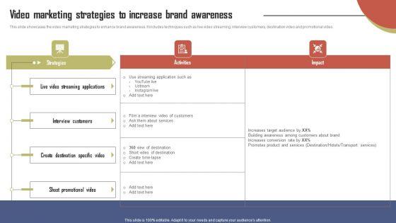 This slide showcases the video marketing strategies to enhance brand awareness. It includes techniques such as live video streaming, interview customers, destination video and promotional video. If you are looking for a format to display your unique thoughts, then the professionally designed Video Marketing Strategies To Increase Brand Awareness Effective Travel Marketing Guide For Improving Inspiration PDF is the one for you. You can use it as a Google Slides template or a PowerPoint template. Incorporate impressive visuals, symbols, images, and other charts. Modify or reorganize the text boxes as you desire. Experiment with shade schemes and font pairings. Alter, share or cooperate with other people on your work. Download Video Marketing Strategies To Increase Brand Awareness Effective Travel Marketing Guide For Improving Inspiration PDF and find out how to give a successful presentation. Present a perfect display to your team and make your presentation unforgettable.