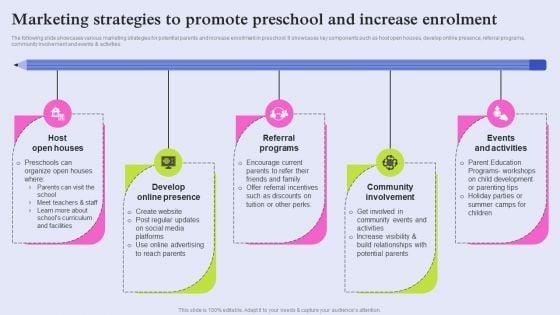 The following slide showcases various marketing strategies for potential parents and increase enrollment in preschool. It showcases key components such as host open houses, develop online presence, referral programs, community involvement and events and activities. Crafting an eye catching presentation has never been more straightforward. Let your presentation shine with this tasteful yet straightforward Marketing Strategies To Promote Preschool And Increase Enrolment Guidelines PDF template. It offers a minimalistic and classy look that is great for making a statement. The colors have been employed intelligently to add a bit of playfulness while still remaining professional. Construct the ideal Marketing Strategies To Promote Preschool And Increase Enrolment Guidelines PDF that effortlessly grabs the attention of your audience Begin now and be certain to wow your customers.