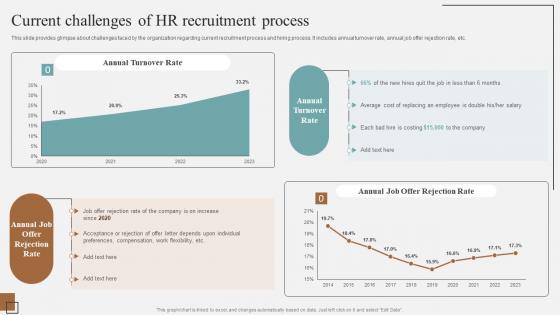 This slide provides glimpse about challenges faced by the organization regarding current recruitment process and hiring process. It includes annual turnover rate, annual job offer rejection rate, etc.Get a simple yet stunning designed Current Challenges Of HR Recruitment Process Guidelines For Streamlined Demonstration Pdf. It is the best one to establish the tone in your meetings. It is an excellent way to make your presentations highly effective. So, download this PPT today from Slidegeeks and see the positive impacts. Our easy-to-edit Current Challenges Of HR Recruitment Process Guidelines For Streamlined Demonstration Pdf can be your go-to option for all upcoming conferences and meetings. So, what are you waiting for Grab this template today. This slide provides glimpse about challenges faced by the organization regarding current recruitment process and hiring process. It includes annual turnover rate, annual job offer rejection rate, etc.