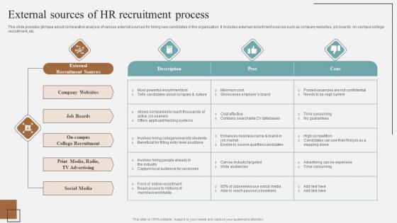 This slide provides glimpse about comparative analysis of various external sources for hiring new candidates in the organization. It includes external recruitment sources such as company websites, job boards, on-campus college recruitment, etc.Slidegeeks is here to make your presentations a breeze with External Sources Of HR Recruitment Process Complete Guidelines For Streamlined Guidelines Pdf With our easy-to-use and customizable templates, you can focus on delivering your ideas rather than worrying about formatting. With a variety of designs to choose from, you are sure to find one that suits your needs. And with animations and unique photos, illustrations, and fonts, you can make your presentation pop. So whether you are giving a sales pitch or presenting to the board, make sure to check out Slidegeeks first. This slide provides glimpse about comparative analysis of various external sources for hiring new candidates in the organization. It includes external recruitment sources such as company websites, job boards, on campus college recruitment, etc.