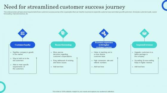 This slide provides glimpse about requirement of new customer success journey in the organization that can help the business to expand its customer base and retain good fit customers. It includes customer loyalty, easier forecasting, improved revenue, etc. Formulating a presentation can take up a lot of effort and time, so the content and message should always be the primary focus. The visuals of the PowerPoint can enhance the presenters message, so our Need For Streamlined Customer Success Journey Overview Of Customer Adoption Process Portrait Pdf was created to help save time. Instead of worrying about the design, the presenter can concentrate on the message while our designers work on creating the ideal templates for whatever situation is needed. Slidegeeks has experts for everything from amazing designs to valuable content, we have put everything into Need For Streamlined Customer Success Journey Overview Of Customer Adoption Process Portrait Pdf. This slide provides glimpse about requirement of new customer success journey in the organization that can help the business to expand its customer base and retain good fit customers. It includes customer loyalty, easier forecasting, improved revenue, etc.