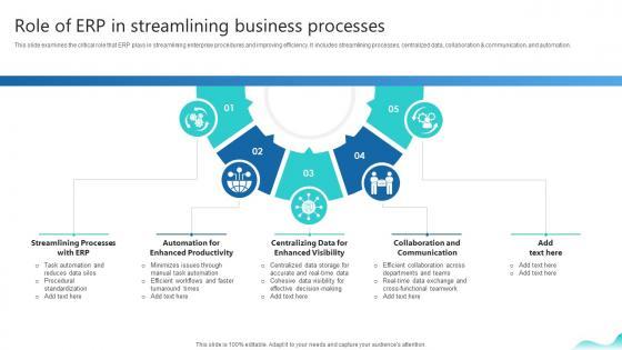 This slide examines the critical role that ERP plays in streamlining enterprise procedures and improving efficiency. It includes streamlining processes, centralized data, collaboration and communication, and automation.Take your projects to the next level with our ultimate collection of Role Of Erp In Streamlining Business Processes Erp And Digital Transformation For Maximizing DT SS V. Slidegeeks has designed a range of layouts that are perfect for representing task or activity duration, keeping track of all your deadlines at a glance. Tailor these designs to your exact needs and give them a truly corporate look with your own brand colors they will make your projects stand out from the rest This slide examines the critical role that ERP plays in streamlining enterprise procedures and improving efficiency. It includes streamlining processes, centralized data, collaboration and communication, and automation.