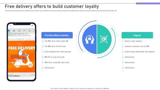 This slide showcases various deals that can be that can be offered to increase sales along with benefits that are reaching a wider audience increasing brand visibility, etc. If you are looking for a format to display your unique thoughts, then the professionally designed Building Stronger Customer Free Delivery Offers To Build Customer Loyalty SA SS V is the one for you. You can use it as a Google Slides template or a PowerPoint template. Incorporate impressive visuals, symbols, images, and other charts. Modify or reorganize the text boxes as you desire. Experiment with shade schemes and font pairings. Alter, share or cooperate with other people on your work. Download Building Stronger Customer Free Delivery Offers To Build Customer Loyalty SA SS V and find out how to give a successful presentation. Present a perfect display to your team and make your presentation unforgettable. This slide showcases various deals that can be that can be offered to increase sales along with benefits that are reaching a wider audience increasing brand visibility, etc.