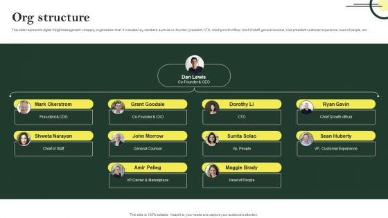 This slide represents digital freight management company organisation chat. It includes key members such as co-founder, president, CTO, chief growth officer, chief of staff, general counsel, Vice president customer experience, head of people, etc. Retrieve professionally designed Org Structure Logistic Company Investor Fund Raising Pitch Deck Template PDF to effectively convey your message and captivate your listeners. Save time by selecting pre-made slideshows that are appropriate for various topics, from business to educational purposes. These themes come in many different styles, from creative to corporate, and all of them are easily adjustable and can be edited quickly. Access them as PowerPoint templates or as Google Slides themes. You do not have to go on a hunt for the perfect presentation because Slidegeeks got you covered from everywhere.