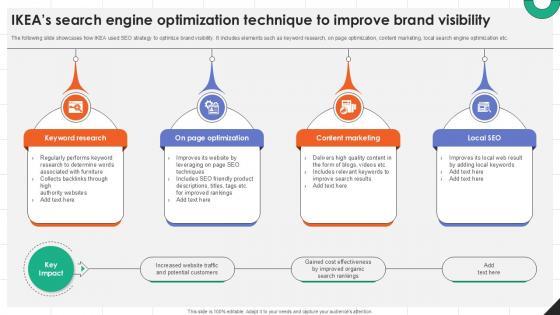 The following slide showcases how IKEA used SEO strategy to optimize brand visibility. It includes elements such as keyword research, on page optimization, content marketing, local search engine optimization etc. Do you have to make sure that everyone on your team knows about any specific topic I yes, then you should give IKEAs Search Engine Optimization IKEAs Successful Market Expansion PPT Template Strategy SS V a try. Our experts have put a lot of knowledge and effort into creating this impeccable IKEAs Search Engine Optimization IKEAs Successful Market Expansion PPT Template Strategy SS V. You can use this template for your upcoming presentations, as the slides are perfect to represent even the tiniest detail. You can download these templates from the Slidegeeks website and these are easy to edit. So grab these today The following slide showcases how IKEA used SEO strategy to optimize brand visibility. It includes elements such as keyword research, on page optimization, content marketing, local search engine optimization etc.