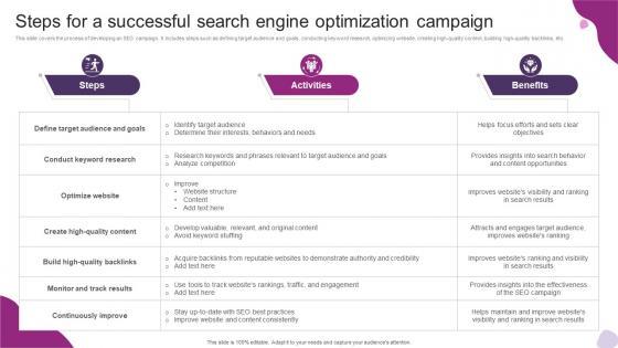 This slide covers the process of developing an SEO campaign. It includes steps such as defining target audience and goals, conducting keyword research, optimizing website, creating high-quality content, building high-quality backlinks, etc. Explore a selection of the finest Steps For A Successful Search Engine Optimization Powerful Marketing Techniques Strategy SS V here. With a plethora of professionally designed and pre-made slide templates, you can quickly and easily find the right one for your upcoming presentation. You can use our Steps For A Successful Search Engine Optimization Powerful Marketing Techniques Strategy SS V to effectively convey your message to a wider audience. Slidegeeks has done a lot of research before preparing these presentation templates. The content can be personalized and the slides are highly editable. Grab templates today from Slidegeeks. This slide covers the process of developing an SEO campaign. It includes steps such as defining target audience and goals, conducting keyword research, optimizing website, creating high-quality content, building high-quality backlinks, etc.