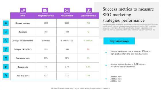 The following slide showcases different key performance indicators KPIs that can assist marketing teams to evaluate search engine optimization SEO marketing campaign performance. The metrics outlined in slide are organic sessions, backlinks, average session duration, cost per click CPC, conversion rate, etc. Welcome to our selection of the Comprehensive Guide To Build Marketing Success Metrics To Measure Seo Marketing Graphics PDF. These are designed to help you showcase your creativity and bring your sphere to life. Planning and Innovation are essential for any business that is just starting out. This collection contains the designs that you need for your everyday presentations. All of our PowerPoints are 100 percent editable, so you can customize them to suit your needs. This multi-purpose template can be used in various situations. Grab these presentation templates today.
